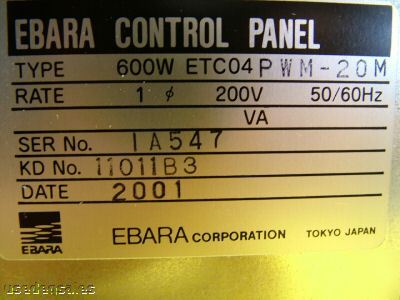 Ebara Turbomolecular Turbopump Controller ET600W * Model No: 600W ETC04PWM-20M * Item(s) sold as shown. If a part is not mentioned or pictured in the ad, then it is not included in the sale. SEMICONDUCTOR EQUIPMENT SPARES Monday – Friday: 8:30 AM - 5:00 PM Mountain Standard Time (MST) Closed Saturday, Sunday and all major US holidays. SEMICONDUCTOR EQUIPMENT SPARES (We do not proofread any ads submitted by members) |
