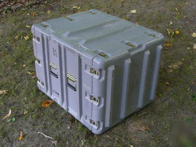 * Rugged one-piece molded seamless covers and shell. * Gasketted molded-in air, dust and watertight seal to keep out humidity, sand, and chemicals. * Zippered pouch in one cover for cables, etc. * Engineered shock mounts giving 2" of sway space. * Front and rear equipment mounting on 10-32 tapped rails. * Recessed handles, latches and hardware protected from damage. * Positive locking system for vertical stacking of cases. Test equipment, power strip, panels, and PC NOT included. (We do not proofread any ads submitted by members) |