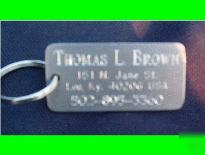 Custom Engraved Metal ID Tags We've chosen a lightweight but durable material for our ID Tags: anodized aluminum. The anodized finish is matte silver with darkened engraving, and suitable even for outdoor use. There is no lacquer finish to scratch. The price includes up to 4 lines of custom engraving to your order. These tags are NOT printed. Your information is engraved into the metal, rather than on it; creating a permanent tag that wears well and will not tarnish. The dull matte finish will match almost any style luggage or bags and the darkened engraving is highly visible. For a more subdued look we can omit the darkening at your request. In addition to use as luggage ID, these plates also feel right at home as a zipper pull or on a key ring. What we engrave on these tags is totally up to you. Obviously they'll serve for any number of purposes. We're here to assist in making sure your copy looks the way you want it to. Quantity discounts are offered: contact us. International inquires are welcome. These tags are also available in a matte black finish with silver engraving in my store. Go to that listing (We do not proofread any ads submitted by members) |