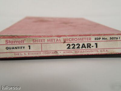 Starrett 222AR-1 Sheet Metal Micrometers. 0-1". Great Condition. Movement is very smooth. There is some minor surface corrosion on the shaft and faces. Includes original box. PLEASE INQUIRE FOR RATES TO HAWAII AND ALASKA or PO boxes. WE REALLY APPRECIATE YOUR BUSINESS!! Be sure to add us to your favorites list! and check out our other items! (We do not proofread any ads submitted by members) |